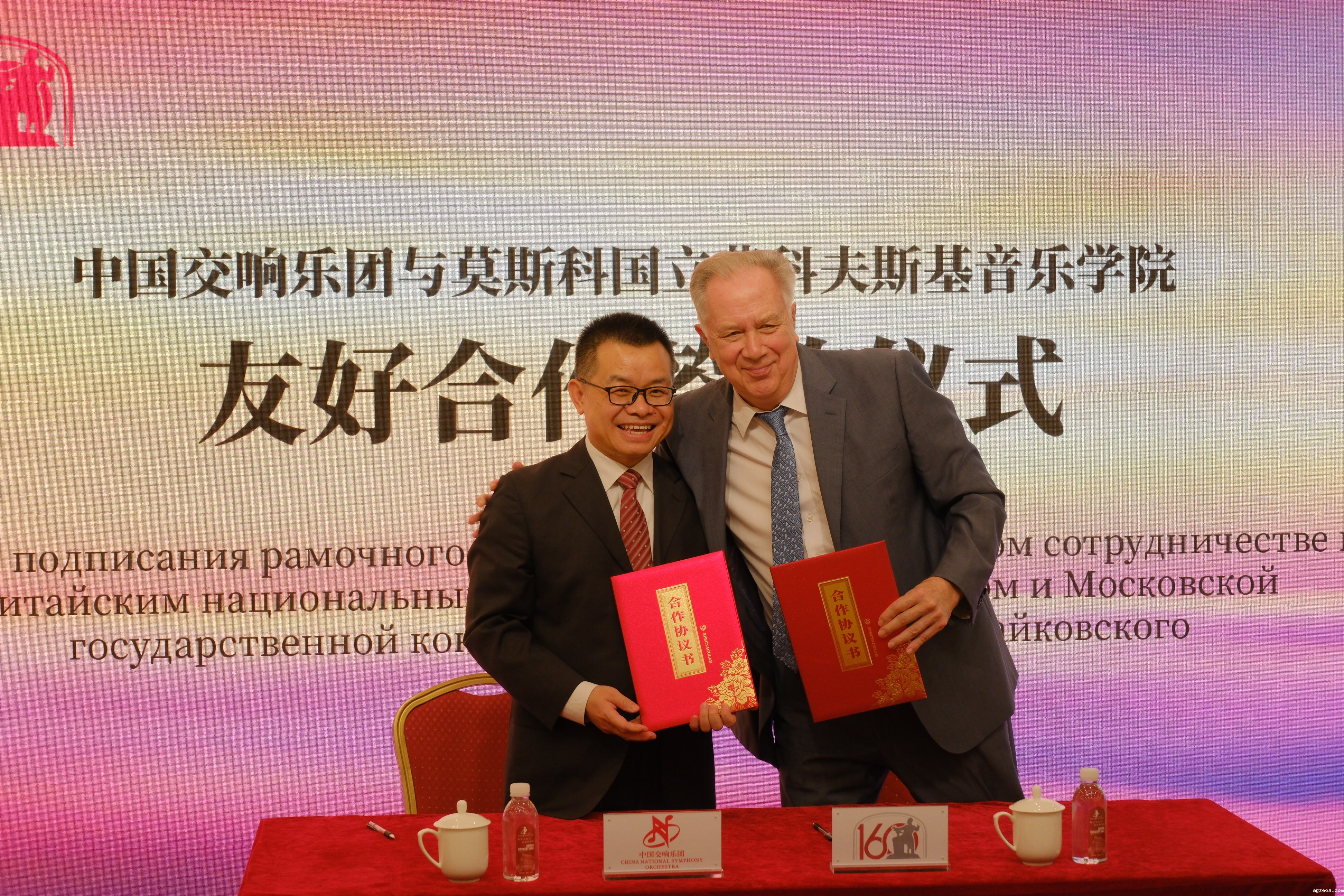 Zhou Yu,the Party Secretary of the China National Symphony Orchestra and Alexander Sokolov,rector of Tchaikovsky Moscow State Conservatory in Beijing on Sept 26